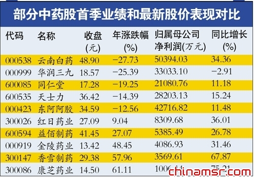 记者对比发现,同是中药企业,但二级市场股价却大相径庭,其中,云南白药、天士力、片仔癀[0.09% 资金 研报]等这些口碑不错的老牌中药股走势疲弱。多数中小中药企业却受到资金的青睐,创业板个股康芝药业[-0.83% 资金 研报]年内涨幅已经达到61.11%。中小板的沃华医药[0.29% 资金 研报]也大涨了30.45%,益佰制药[-1.04% 资金 研报]上涨27.07%。另外,康缘药业[-0.92% 资金 研报]、贵州百灵、红日药业[0.33% 资金 研报]以及太龙药业[0.00% 资金 研报]等都表现不错。