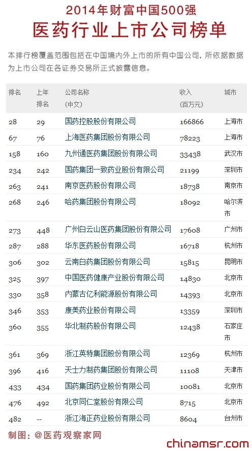 今年,医药、生物制品、医疗保健行业共有18家上市公司入围中国500强榜单,整体排名较去年有所上升。具体来看,国药控股股份有限公司以1668.66亿元的年收入位列总榜单第28位、行业第1;上海医药集团股份有限公司以782.23亿元的年收入位列行业第2;浙江海正药业股份有限公司为新入围榜单的药企。由于华润医药、广州医药等未整体上市,其旗下上市公司未进入榜单。