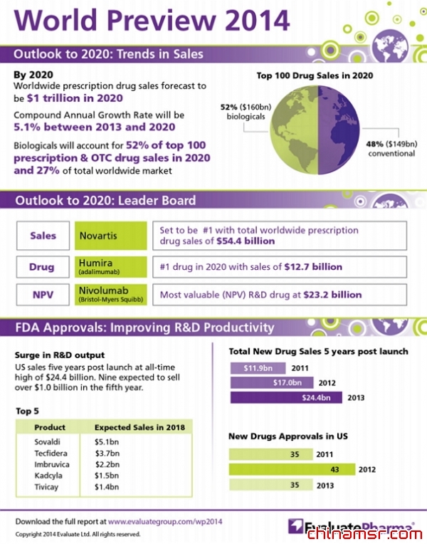 最近,医疗健康领域全球领先的行业及市场调研公司EvaluatePharma推出“回顾2014,展望2020”医药市场调研报告,该报告指出医药市场前景可期,从上图可以看出: