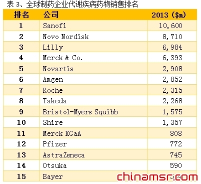 代谢疾病领域,全球前几名厂商均在糖尿病领域有充分的布局,如赛诺菲(Sanofi)、诺和诺德(Novo Nordisk)、礼来(Lilly)为全球三大胰岛素巨头,默克(Merck & Co.)则凭借口服降糖药捷诺维成为抗糖尿病领域的新星。
