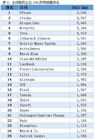 中枢神经系统领域,辉瑞(Pfizer)、大冢(Otsuka)、百健艾迪(Biogen Idec)、诺华(Novartis)、梯瓦(Teva)2013年该领域销售额分别位列前五名,均在50亿美元以上。
