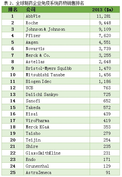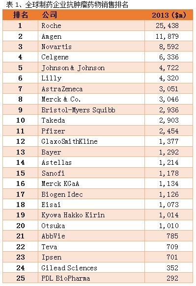 抗肿瘤药物领域,罗氏(Roche)公司可谓一家独大,2013年抗肿瘤相关药物销售额达254亿美元。罗氏的霸主地位主要得益于收购基因泰克(Genentech)获得了赫赛汀、阿瓦斯汀、美罗华等重磅抗肿瘤单抗药物产品。紧随其后,安进(Amgen)公司以119亿美元的销售额位列第二,其余制药企业在抗肿瘤领域的销售额则呈现快速下降趋势,排名第25名的PDL BioPharma销售额仅为2.92亿美元,行业集中度较高。