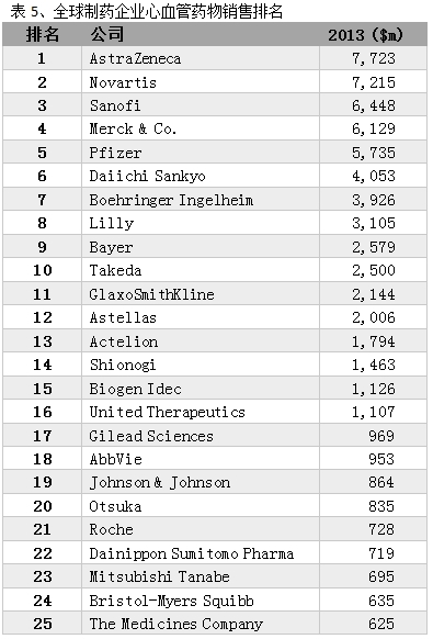 2013年心血管领域药品销售额超过50亿美元的公司同样有5家,分别是阿斯利康(AstraZeneca)、诺华(Novartis)、赛诺菲(Sanofi)、默克(Merck & Co.)、辉瑞(Pfizer),前5大企业销售额合计333亿美元。