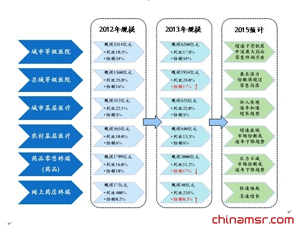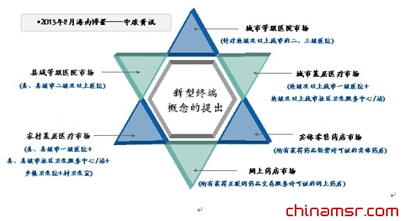 中国医疗基层体系的构建和移动互联网的迅猛发展,促使“中国药品市场新型终端”快速形成,未来中国药品市场将由目前的医院、药店和社区三个终端,被细分为六个终端:城市等级医院市场、县域等级医院市场、城市基层医疗市场、农村基层医疗市场、实体零售药店市场和网上药店市场(参见下图)。