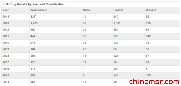 FDA过去两年里的数据显示:从2013年到今年7月份,FDA累计召回药物种类多达2061种,而在这之前的9年里,累计召回药物才2217种。