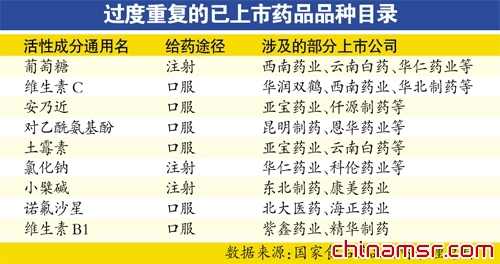 昨日,国家食品药品监督管理总局网站公布首批过度重复药品品种目录,其中包括已上市药品品种34个、过度重复申报注册的药品品种16个,借此提醒企业和投资者评估研发风险。“名列前茅的品种可能已趋饱和。扎堆生产同质化常见药、不愿碰罕见病药成当下现状,除市场自然淘汰外,还需要政策适当引导分流,避免医药资源浪费。”广州本地一位中医科主任表示。记者查询发现,不少上市公司均有产品涉及其中,未来或面临品牌集中度提高、数量减少等改变。不过,由于多数都不是独家产品,预计对上市公司业绩影响有限。