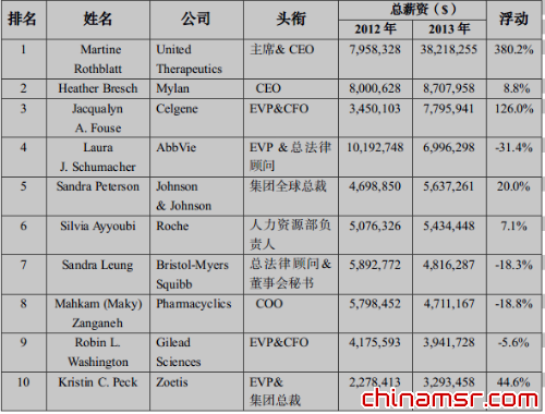 上周,GEN评选出了全球年薪最高的生物制药CEO Top20。来自联合治疗公司的Martine Rothblatt成为历史上首位荣登榜单之首的女性。她在2013年的全年年收入超过3800万美元,较2012年涨幅近4倍。
