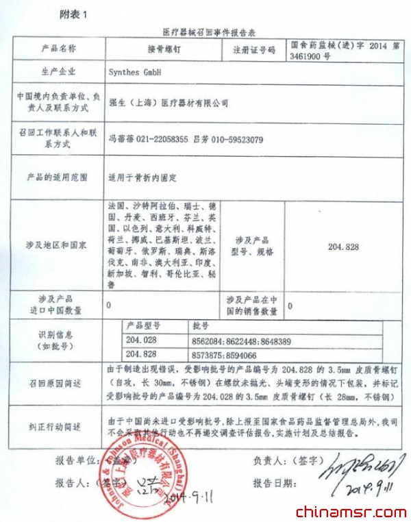 CFDA称,9月15日收到强生(上海)医疗器材有限公司报告,该公司代理的接骨螺钉(注册证号:国食药监械(进)字2014第3461900号)由于制造出现错误等原因,其生产商瑞士Synthes GmbH公司对该产品进行主动召回。该公司称此次召回产品未在中国销售。请各省、自治区、直辖市食品药品监督管理局加强对此类产品的监督管理。