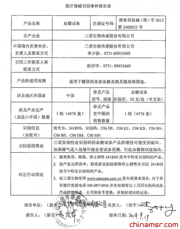 此外,由于产品防潮性可能受到破坏等原因,三诺生物传感股份有限公司对其生产的血糖试条(注册号:湘食药监械(准)字2012第2400053号)主动召回。召回级别为三级。批号为:2418NS,识别码为C06EE、C06EZ、C06KB、C06BN、C06BE、C06DM、C06MN。(ispring)