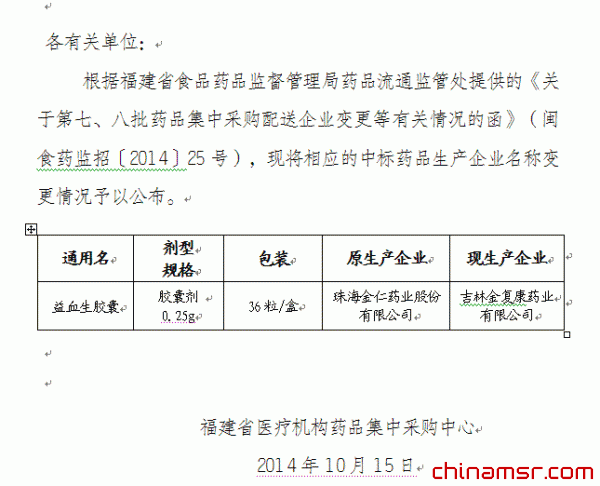 2014年福建省关于第七、八批药品集中采购部分中标企业名称变更的通知(六十五) (百度虫医药商务网)