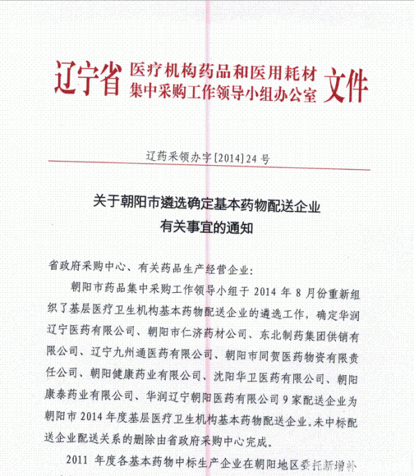 2014年辽宁省关于朝阳市遴选确定基本药物配送企业有关事宜的通知