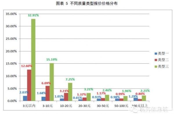 安徽方案商务标分三个质量层次,不同质量层次赋值有所不同。如下图所示,质量类型三(包括中药组合物专利药品、实用新型专利、生产工艺专利、中药保护二级、国家质量标准起草单位、其他GMP药品)的药品3元以内的占比是最多的,质量类型三100元以上的占比只有2.21%,这和国内药品的研发能力以及创新投入水平是息息相关的。价格区间在10元以下的占48.1%。质量类型一和质量类型二的价格区间集中在3元到20元以内。