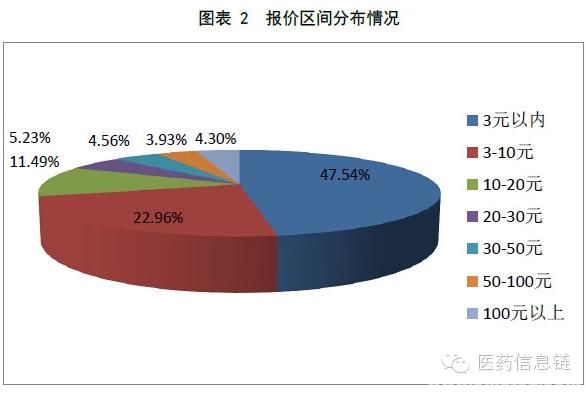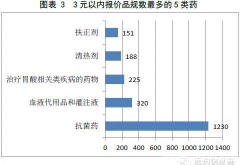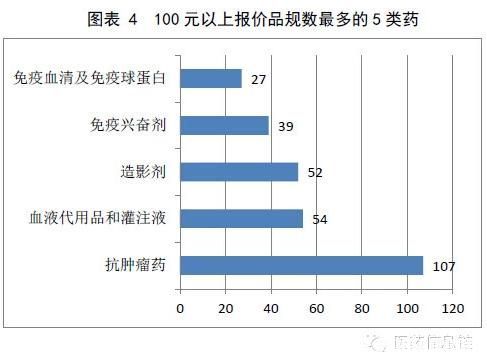 3元以内的报价品规数最多的为抗菌药(如图3),100元以上的高价药以抗肿瘤药最多(如图4)。