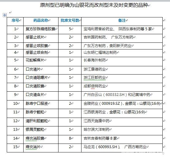 沸沸扬扬争议了近半年的“山银花”事件,已有初步结果。国家药监总局(CFDA)发布的《关于<中国药典>分列管理中药材品种有关问题的复函》中,要求各生产企业将处方中金银花明确为山银花的,将金银花变更为山银花投料生产,并按要求进行备案说明。金陵药业(000919.SZ)、马应龙(600993.SH)、白云山(600332.SH)等公司的15个改剂型品种(见附表)涉及其中。