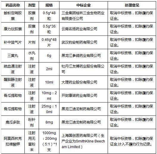 一、给予申请废标的三金集团桂林三金生物药业有限责任公司等8家生产企业,取消中标资格、扣除履约保证金的处理。