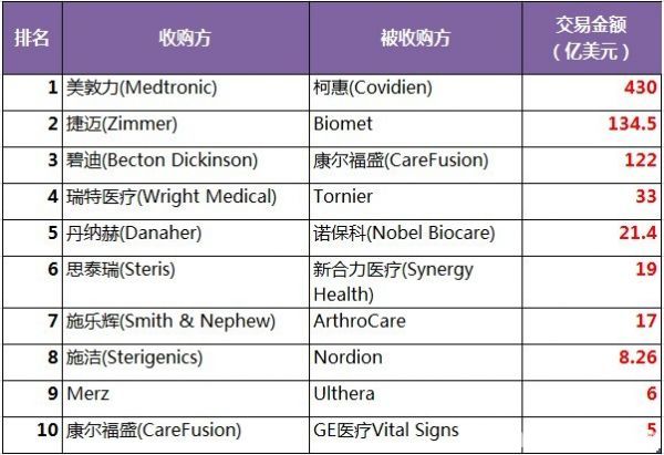 863.9亿美元的总交易额中将近一半来自于一笔超级大收购:美敦力(Medtronic)以430亿收购柯惠(Covidien)。排除掉这笔交易后,另外了56笔交易总价值为434亿美元,仍旧比2013年高203.4%。另外,医疗器械行业今年的头十大并购交易总额为796亿美元(排除美敦力/柯惠后,是366亿美元)。