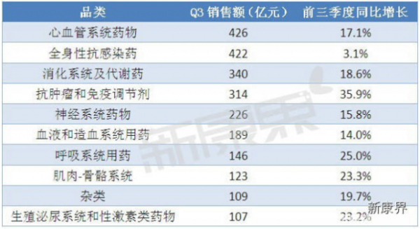 但增长速度最快的品类是抗肿瘤和免疫调节剂,前三季度同比增长35.9%,2014年Q3的市场规模已经达314亿元。