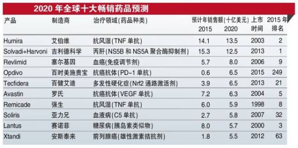 分析师预测Solvadi和Harvoni的销售额将在上市后3年的2016年到达顶峰。修美乐预计将于上市后14年的2017年达到顶峰,并在2020年取得销售冠军宝座。