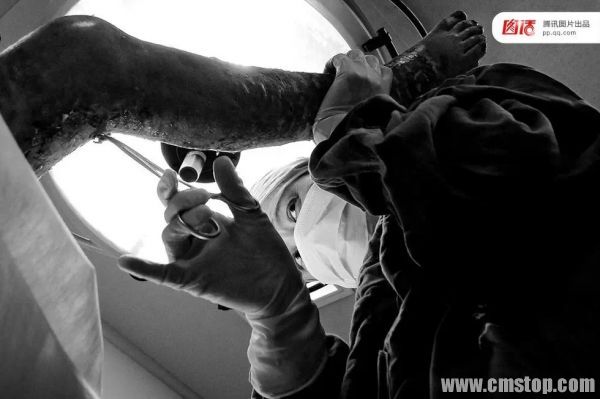 孙医生用镜头定格下了外科医生的酸甜苦辣。图为2006年10月29日晚10点,一名患双侧股动脉瘤的艾滋病人因注射毒品造成瘤体破裂大出血,医生护士争分夺秒止血、处理伤口。这是一场与死神的搏斗,急诊现场气氛紧张。