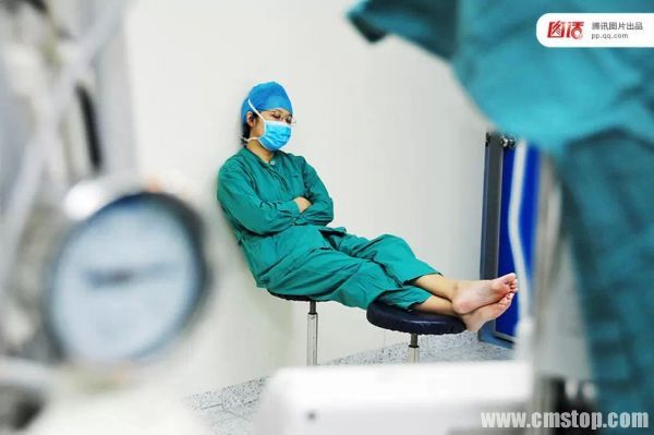 图为一名护士小姑娘在两台手术的间隔中,累得趴在椅子上睡着了。