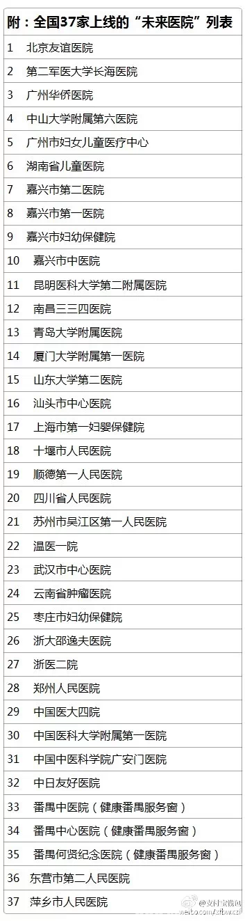 昨日,支付宝通过官方微博首次“晒出了”自2014年5月开展“未来医院”的成绩单。根据官方透露的最新数据,截止到目前,“未来医院”已在北京、上海、杭州、广州、南昌、郑州、长沙、昆明、武汉等25个省市落地,覆盖37家医院,累计为超过30万个患者提供服务。