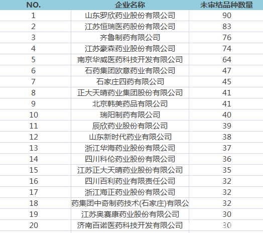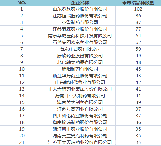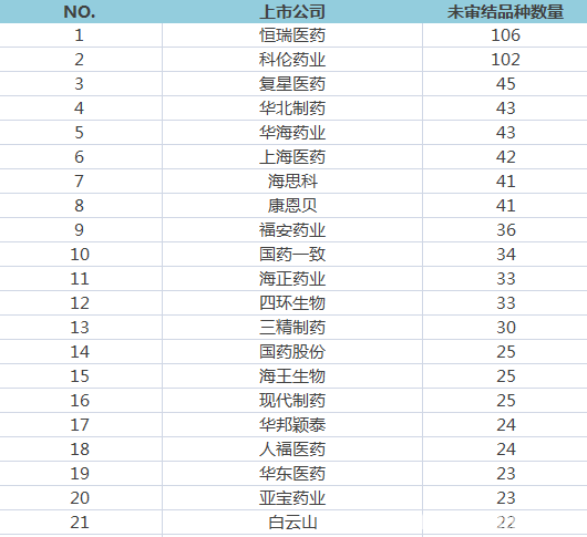 未审结品种数量多,不等于牛。如果你的品种全在重复申报清单中,那么,你的风险自然很大。我们采用一种极端的算法,把但凡进入CFDA公示的重复申报目录品种都判个死刑。进而,我们在上述统计中剔除所有重复申报品种,对剩余品种进行重新统计。结果如下。