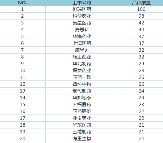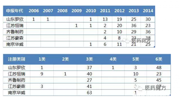 (4)很多品种为多家联合申报,在统计时,我们是拆开重复算帐,即一个品种会同时在多家联合申报公司名下计数。举个例子:豪森的一些品种是以豪森公司和豪森研究院联合申报的,在统计中,我们把同一个品种的计数会同时算到两个主体头上。因此,豪森公司品种数量+豪森研究院品种数量>整个豪森公司品种数量。
