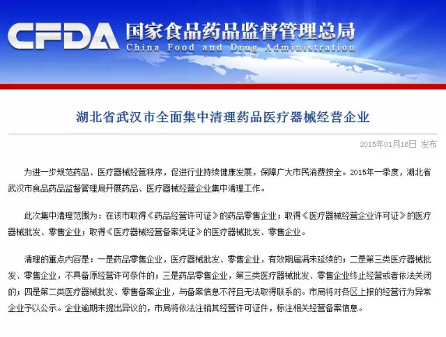 日前国家药监总局发布一则资讯《湖北省武汉市全面集中清理药品医疗器械经营企业 》,以下为原文。