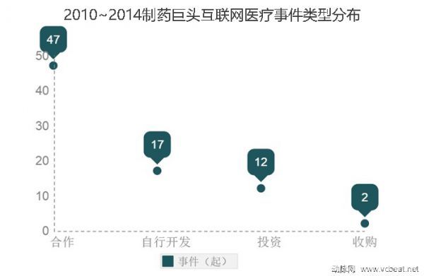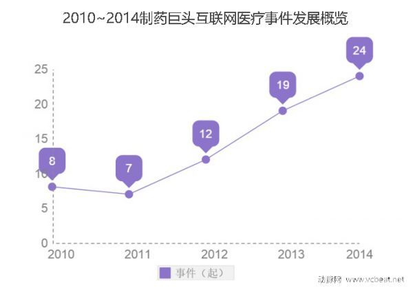 据动脉网互联网医疗研究院数据库统计,在2010~2014五年中制药巨头布局互联网医疗领域共发生70起事件,并随着时间事件数量累年递增,从数据上看,自2012年后,巨头们就加紧了互联网医疗的布局,这也反映了互联网医疗这渐热的市场不仅有初创,更有老牌们的低调进驻。