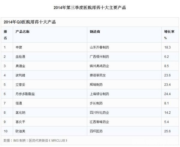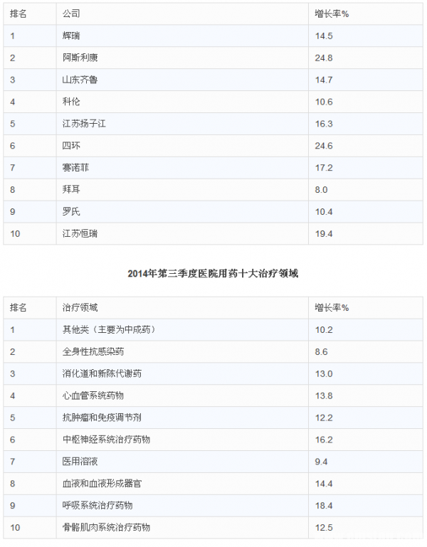中成药目前已经成为中国医院市场最大的治疗领域,但在第三季度出现了增速放缓的趋势,其2014年第三季度的销售额为人民币317.07亿元,增长率为10.2%。全身性抗感染类产品的增长率为8.6%,消化及代谢领域药品增长率为13.0%。