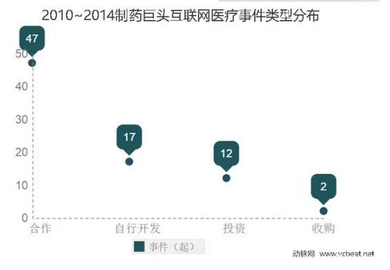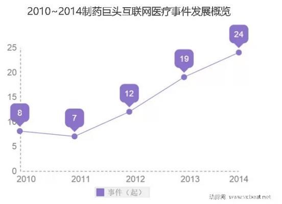 据互联网医疗研究院数据库统计,在2010~2014五年中制药巨头布局互联网医疗领域共发生70起事件,并随着时间事件数量累年递增,从数据上看,自2012年后,巨头们就加紧了互联网医疗的布局,这也反映了互联网医疗这渐热的市场不仅有初创,更有老牌们的低调进驻。