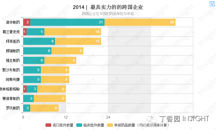 诺华制药以获批和申报了43个品种的绝对优势荣获2014年度跨国企业最具实力奖,遥遥领先于其他跨国企业。