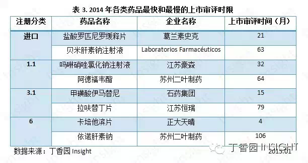 批准上市较快的药品中,葛兰素史克、江苏豪森和石药集团申报上市的药品等待了1-3年。上市较慢的药品中,苏州二叶的1.1类药品和Laboratorios公司的进口药品上市申报审评时间均为5年,江苏恒瑞申报的3.1类药品拉呋替丁多等待了1年,苏州二叶申报的仿制药依诺肝素钠则等待了8年之久,终于守得花开见月明(见表3)。