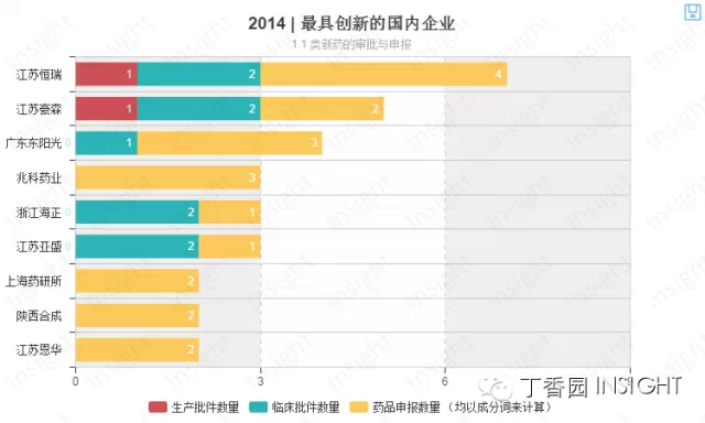 2014年江苏恒瑞取得了1个生产批件、2个临床批件和4个申报1.1类新药的好成绩,毋庸置疑地领跑中国制药企业的研发创新之路,并荣获2014年度国内企业最具创新奖。