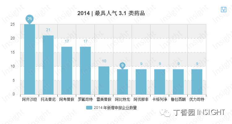 3.1类的阿齐沙坦在2014年新增了25家申报企业后,其申报企业总数达到了49家,获得2014年度3.1类药品申报最具人气奖。