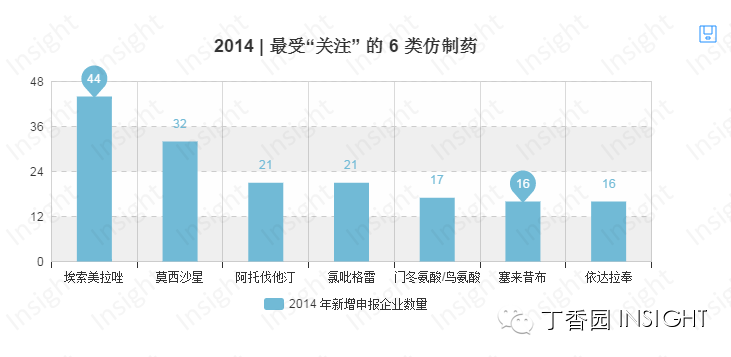 用于治疗胃食管反流病的埃索美拉唑,仿制药申请逐年增加,2014年新增44家,获得2014年度6类仿制药最受“关注”奖。