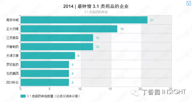南京华威医药这一年共申报了21个品种,获得2014年度3.1类药品最“钟情”奖。