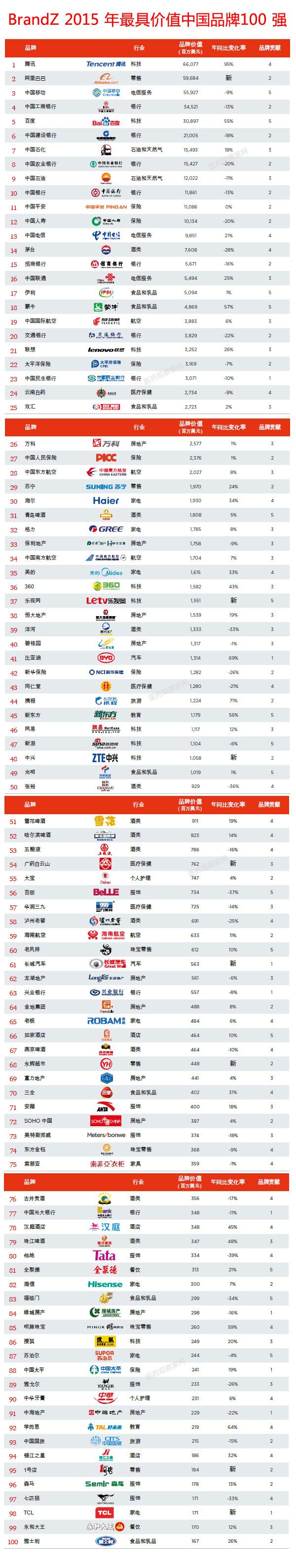 全球知名传播服务集团WPP旗下市场调研机构华通明略公司27日推出2015年BrandZ最具价值中国品牌100强榜单,榜单显示中国品牌大有潜力,中国品牌价值呈现迅猛增长势头。