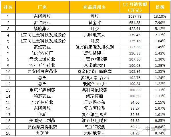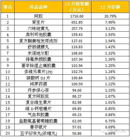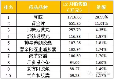 按药品品牌统计,2014年12月前5个品牌中有3个阿胶产品,其中东阿的销售额超过1000万元。