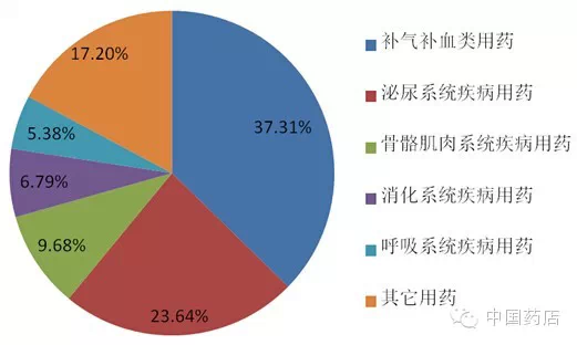 中成药中,补气补血类用药和泌尿系统疾病用药销售额都超过千万元,其中补气补血类用药12月销售额超过2000万元,占比37.31%。