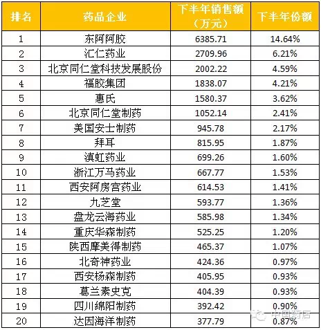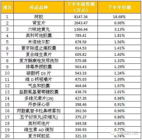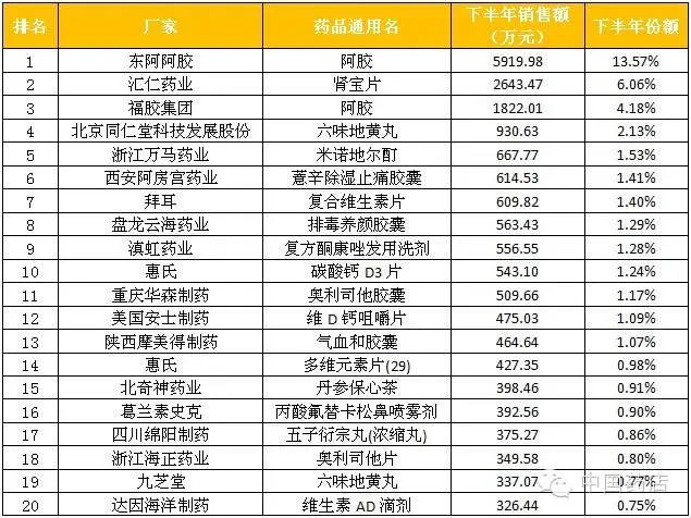 按下半年统计,销售额过千万的企业有6个,其中5个为中成药企业。
