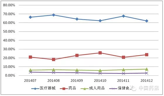 2014年12月,药品销售占整体天猫医药馆销售比例为23.74%,医疗器械占比仍是最多,达到62%。2014年下半年(7-12月),天猫医药馆医疗器械的销售占比在60%-70%,药品销售占比在20%-30%之间波动,成人用品和保健食品的销售占比则相对平稳。