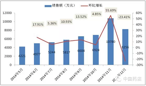据店讯通研究院统计,2014年12月天猫医药馆药品销售额为8256万元,环比下跌23.41%。经历了“双十一”的促销后,药品销售额环比下滑属于正常现象。另外由于12月份还有“双十二”的小规模促销,所以整体销售额同9月份和10月份相比,仍有增长。