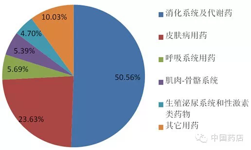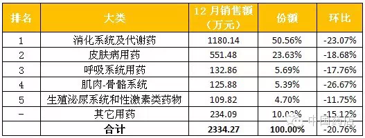 西药大类中,12月份只有消化系统及代谢药的销售额超过1000万元,占西药销售额比例超过五成。