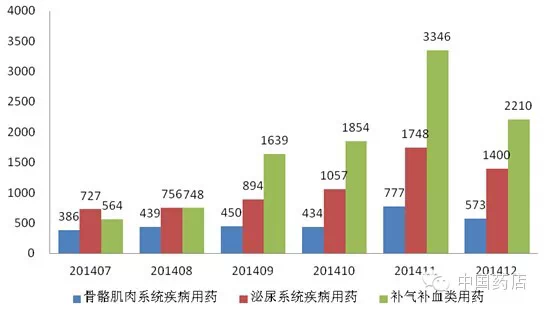 2014年下半年横向统计,泌尿系统疾病用药类别曾在中成药中销售最多,但自从阿胶涨价后,补气补血类用药的销售额显著增长,并大幅抛离其它类别。