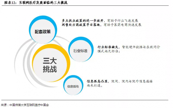 挑战之一,配套政策。报告指出,目前互联网医疗对于政策支持的期许主要存在于两个方面。首先是希望多点执业政策进一步放开。互联网拥抱医疗激发了广大患者的需求,然而我国医师多点执业政策却因为多方面原因遇冷。没有医生资源的大量流入,互联网医疗的发展也将遭遇瓶颈。其次是希望网售处方药政策尽早落地。我国现有的医药市场中,处方药的需求占比高达80%,且处方药种类多,有刚性需求,若网售处方药的政策彻底开放,势必将对医药电商的整体销售带来巨大的增量。