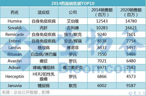 古龙曾经说过,有人的地方就有江湖。如果把医药产业比作纷乱的江湖,各大医药公司比作一位位绝世高手,那么这些生物医药公司旗下的畅销药物可谓是这些"高手"们的神兵利器。因此,每年的畅销药物排行榜也就成为了"江湖中人"关注的重中之重。最近,分析人士统计出了2014年生物医药产业销售额最高的十大药物。这十种药物的销售总额达到了惊人的830亿美元之多,更引人瞩目的是其中的生物制药占据了七种之多。其中的前三甲分别是艾伯维公司的Humira、吉利德公司的Sovaldi以及强生和默沙东公司共有的Remicade,而Humira以及Sovaldi的年销售额均突破了100亿美元,分别达到了125亿美元和108亿美元之多。而这远远不是结束,预计到2020年这两种药物的销售额将分别上升至147亿美元和166亿美元以上。而按照药物的适应症进行归类,治疗癌症的药物占据了排行榜中的六席,此外治疗糖尿病的药物有两种上榜,分别是赛诺菲的Lantus和默沙东的Januvia。可以说,这些畅销药物已经成为了这些生物医药巨头占据生物医药市场领导地位的杀手锏。