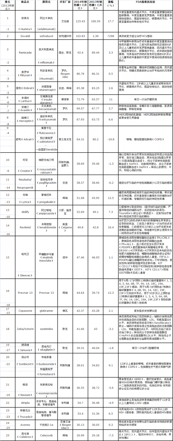 2014年全球销售额最高的25个药物(数据来源GEN)