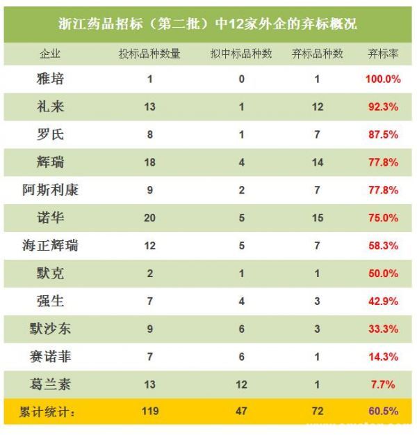 事实上,在浙江招标产品价格梳理结果刚发布时,就有很多药企感觉不妙,特别是一些外资药企。3日10日,浙江第二批投标价格梳理结果出来,笔者同相关外企的高管沟通中就已得到外企会大范围弃标的信息。一家知名外企高管告诉笔者,对是否弃标,公司专门开会讨论,会上争论很大,最终由老板拍板确认弃标。