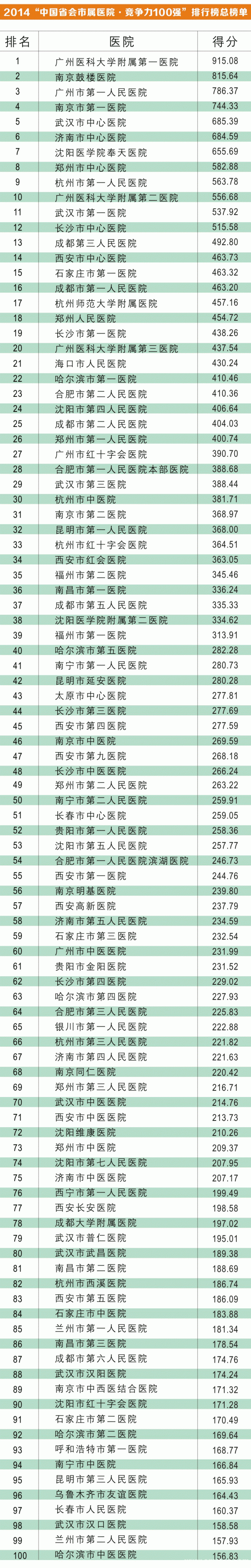 2015年3月28日晚上,在广州中国大酒店举行的“2015中国医院竞争力论坛”上,香港艾力彼医院管理研究中心发布了“2014中国省会市属医院竞争力100强”名单,广州医科大学附属第一医院、南京鼓楼医院、广州市第一人民医院、南京市第一医院和武汉市中心医院名列榜单的前五位。